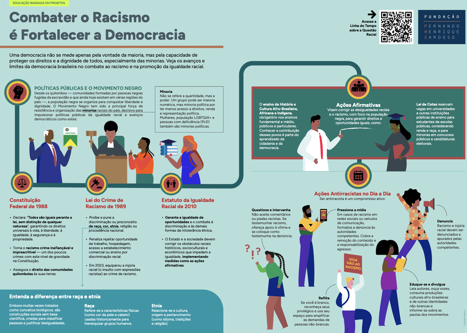 Disponível para download gratuito, este material educativo propõe uma análise sobre as relações entre democracia, racismo e políticas públicas, destacando como essas esferas se conectam na história e no presente do Brasil. Por meio de um infográfico e de atividades voltadas à sala de aula, o conteúdo incentiva alunos e professores a refletirem sobre o papel das instituições, das leis e da sociedade civil na superação das desigualdades raciais.